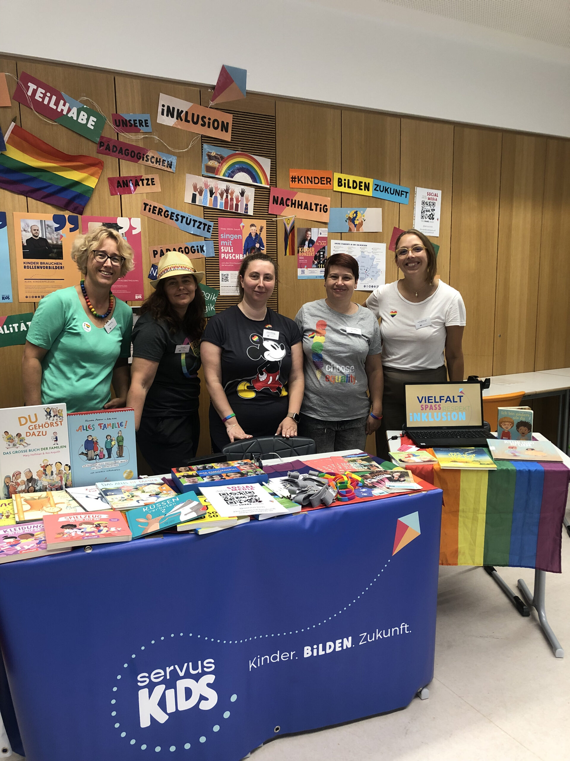 Nicht nur die servusKiDS-Farben sind bunt – auch unser Team, unsere Kinder und Familien sind es. servusKiDS steht für Vielfalt. Daher haben wir uns auf der Messe der Städtischen Fachakademie für Sozialpädagogik München Mitte als LBGTQIA+ friendly Arbeitgeberin den Studierenden vorgestellt. Mit im Gepäck waren viele Kinderbücher für große und kleine Kinder sowie Fachliteratur für pädagogisches Personal.